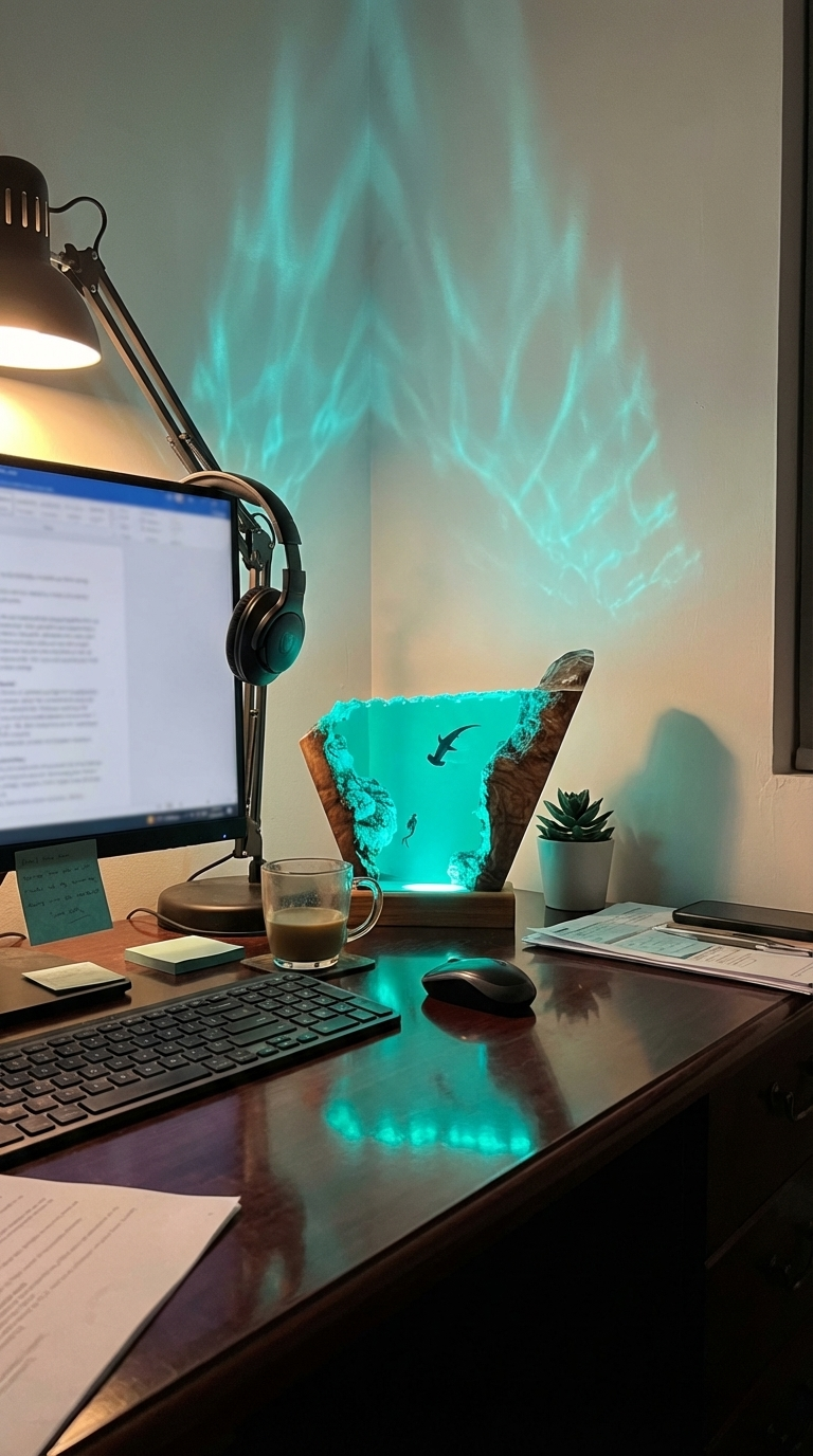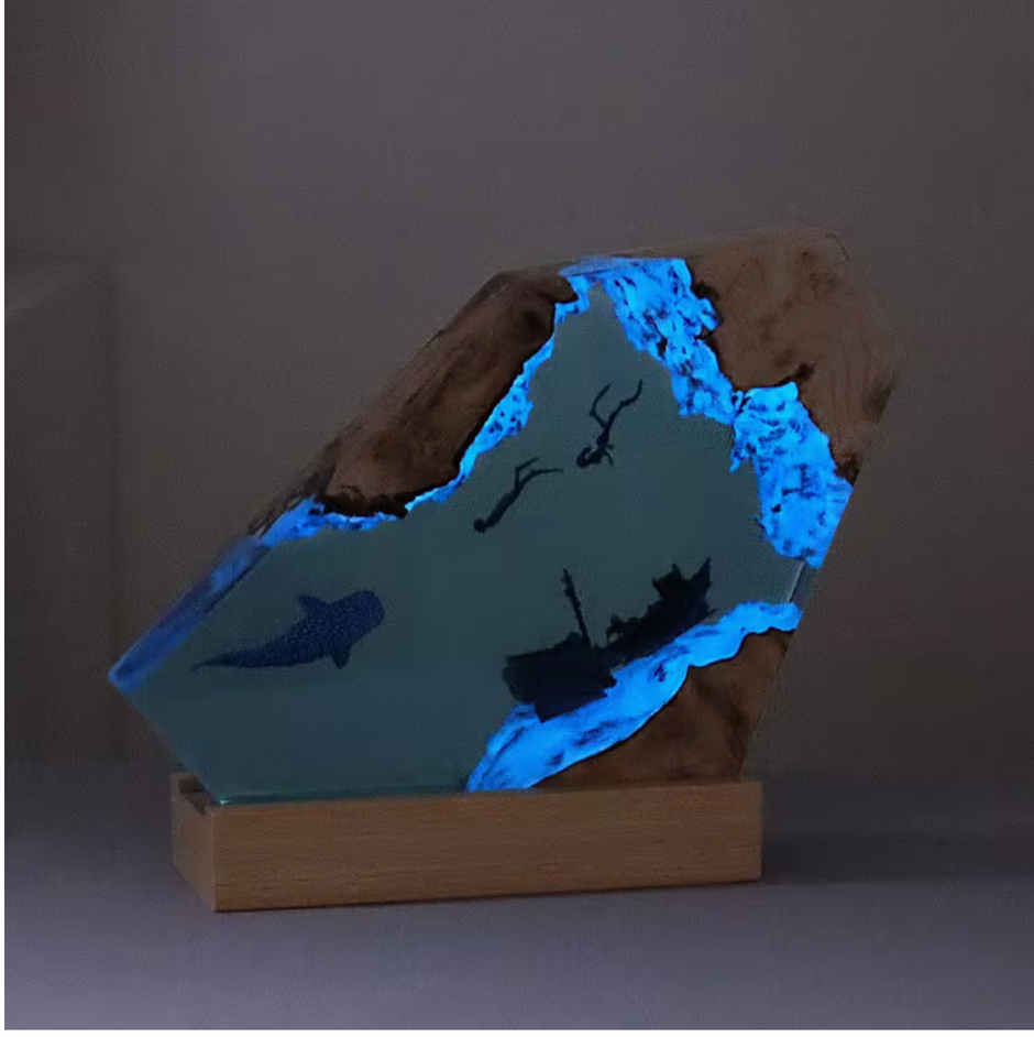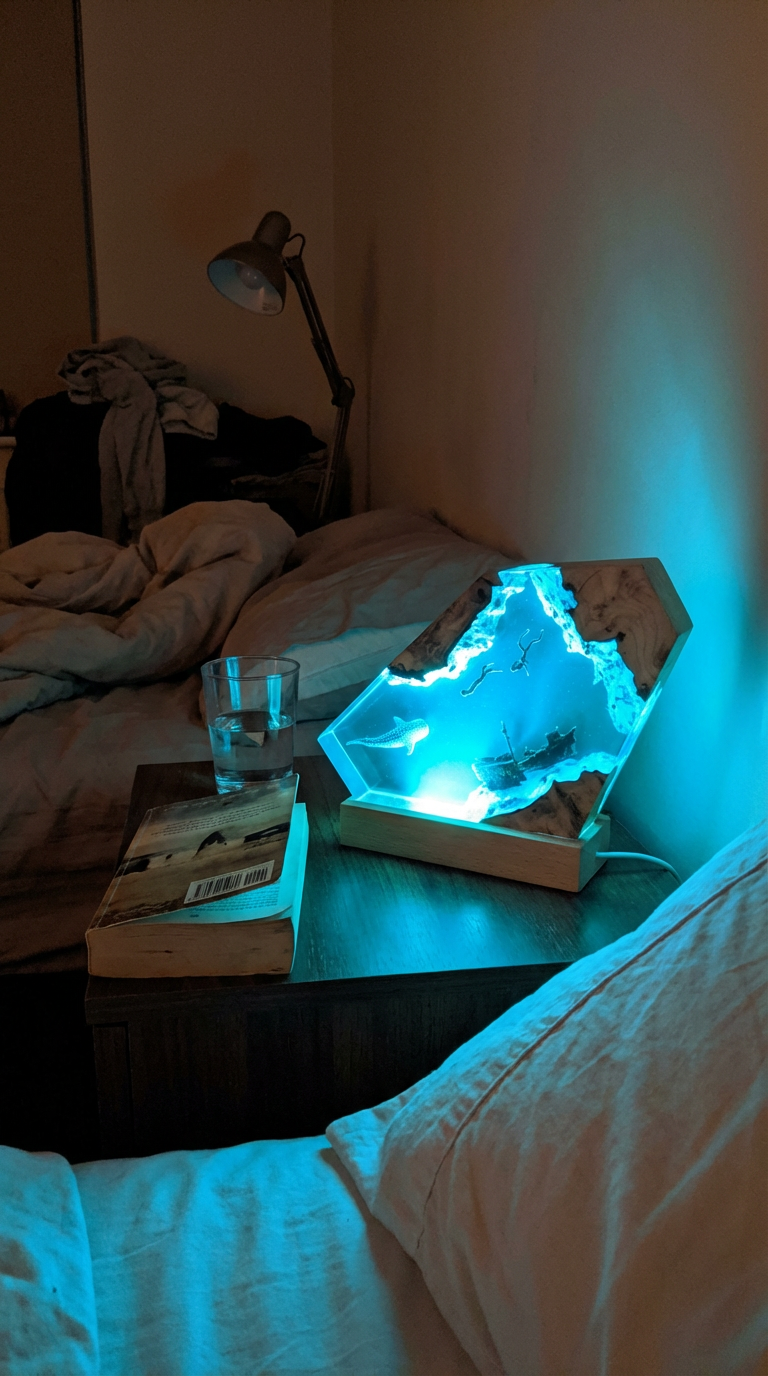 Chaque lampe est sculptée à la main en résine époxy — une pièce unique qui transforme votre intérieur en fond marin.
