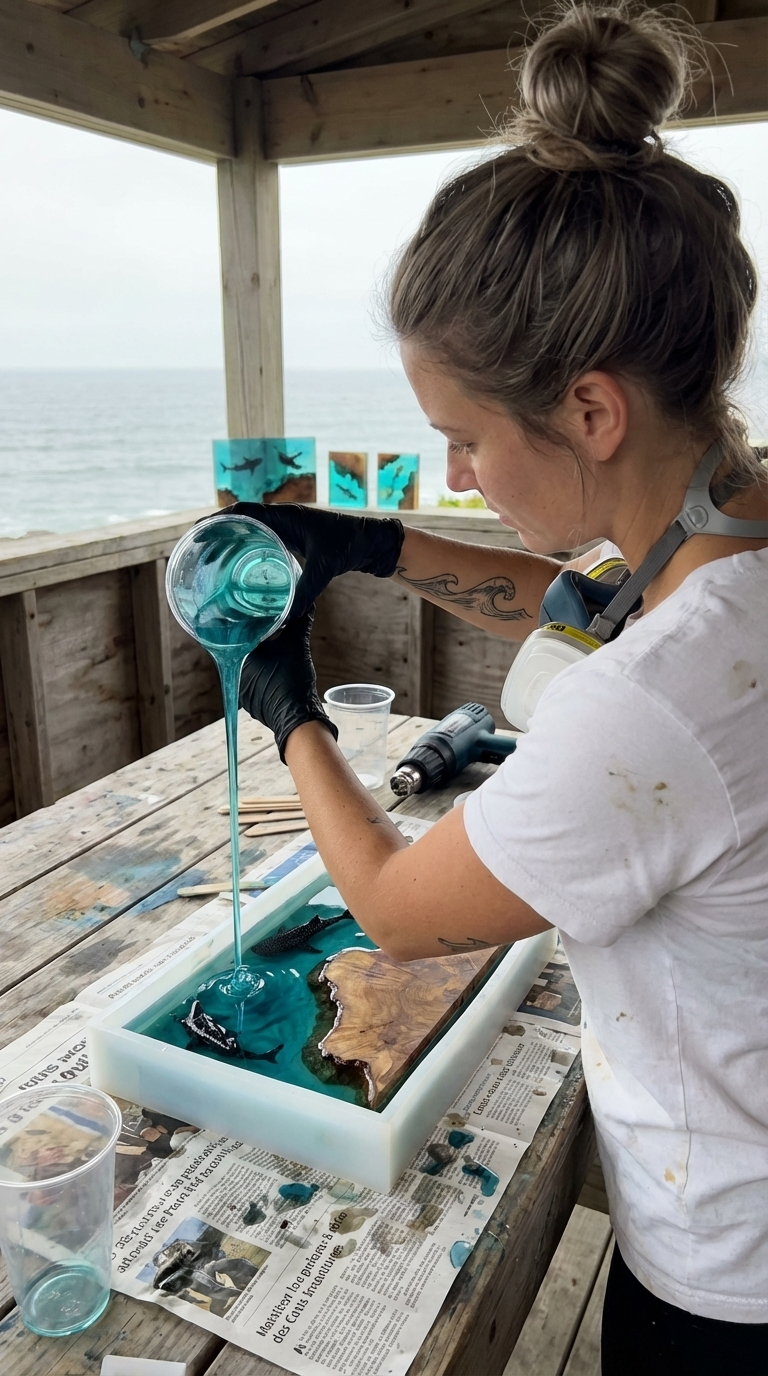 La résine océan est pigmentée et coulée en couches successives — chaque figurine placée à la bonne profondeur avec des brucelles.