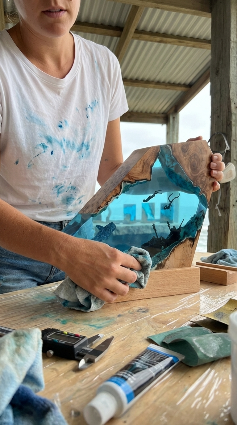 Après 48h de cure, la pièce est taillée, poncée grain par grain et polie jusqu'à la transparence — la résine devient une fenêtre sur l'océan.